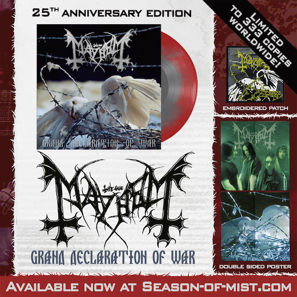 Today, Season of Mist is celebrating the album’s 25th anniversary with a special edition of Grand Declaration of War. Along with the original master, this sunburst colored gatefold LP includes new silver hot foil packaging, a double-sided poster, and an embroidered leather patch.