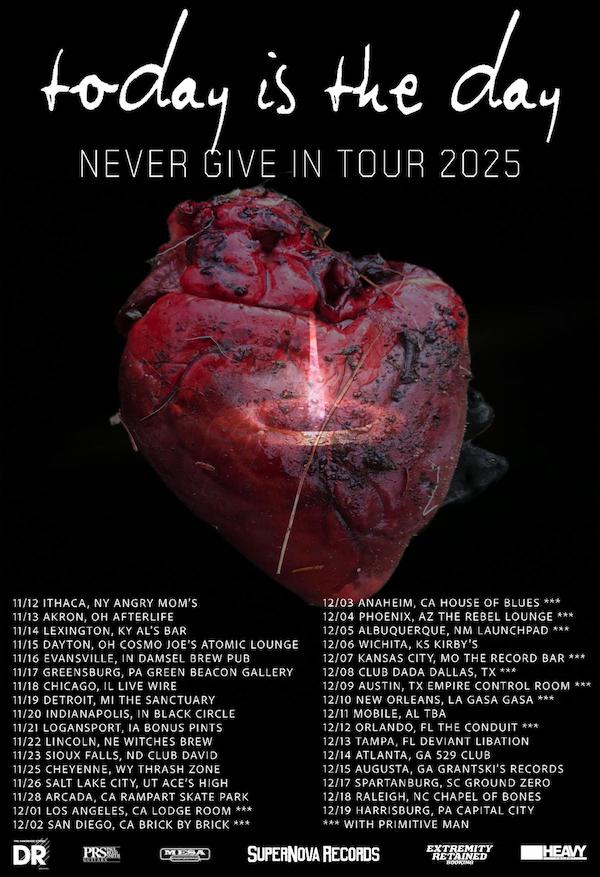 Today is the Day is about to tour across the county and back in support of their fourteenth LP, Never Give In via SuperNova Records. Beginning in Ithaca, New York on November 12th, the Never Give In Tour 2025 sees the band playing a string of headlining shows as they tour westward to support Primitive Man from December 1st through 12th. Today is the Day will then headline another run of shows on their way back to the East Coast, ending December 19th in Harrisburg, Pennsylvania. View the current routing below, and expect further updates to follow shortly.