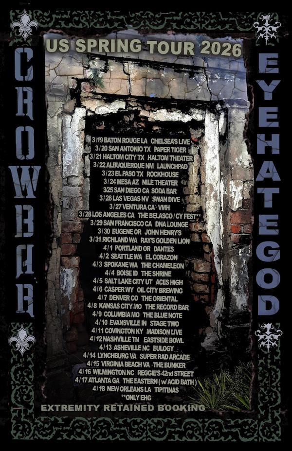 Louisiana metal legends Crowbar – led by riff lord and vocalist Kirk Windstein with guitarist Matt Brunson, drummer Tommy Buckley, and returning bassist Pat Bruders (Down, ex-Goatwhore) – will join their brethren in Eyehategod for the second leg of their US co-headlining tour this Spring. The journey begins on March 19th in Baton Rouge and runs through April 18th in New Orleans. As an added bonus, Bl’ast will appear on select dates. Tickets are on sale, and available for purchase here. See all confirmed dates below.