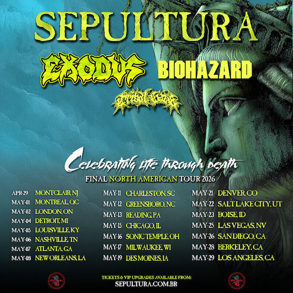 Kicking off on April 29 in Montclair, NJ, the ‘Celebrating Life Through Death’ tour will visit major cities across the U.S. and Canada, including Montreal, Detroit, Chicago, Denver, and Los Angeles, before concluding on May 29 at The Wiltern in Los Angeles. Along the way, Sepultura will also perform at major festivals, including Welcome to Rockville and Sonic Temple. Tickets are on sale now. Get yours here.